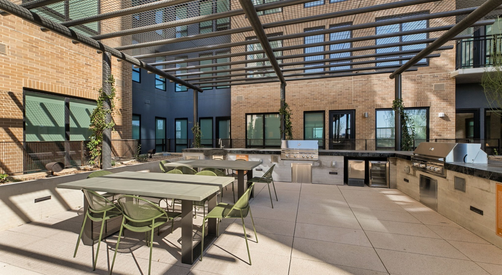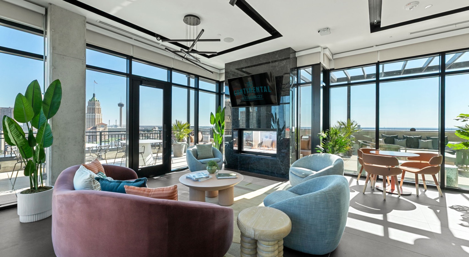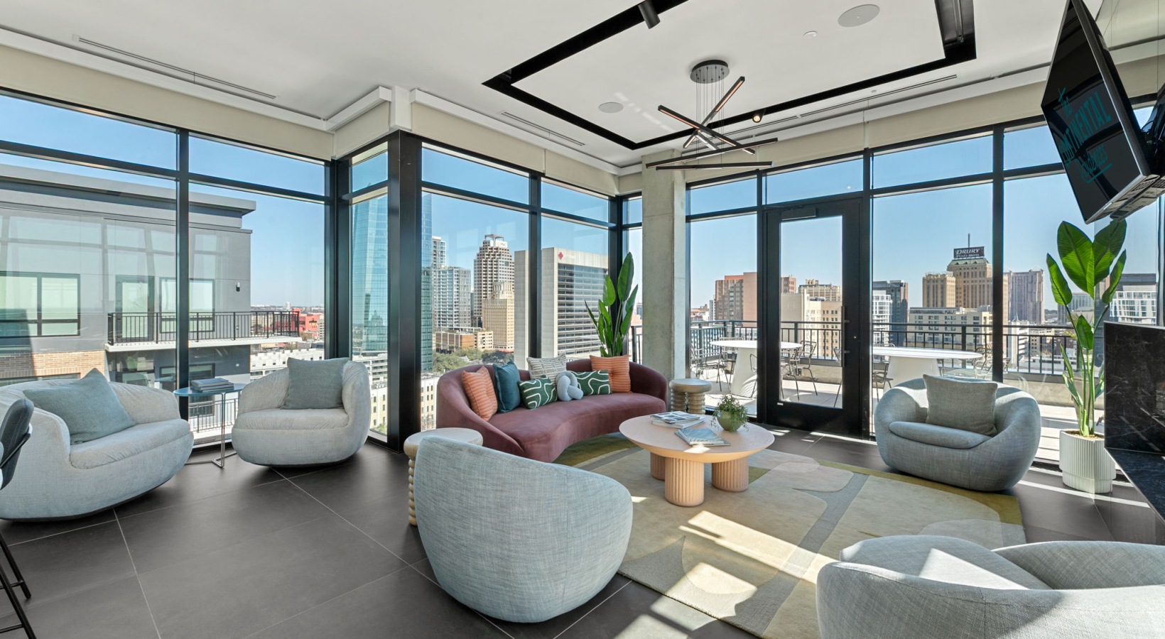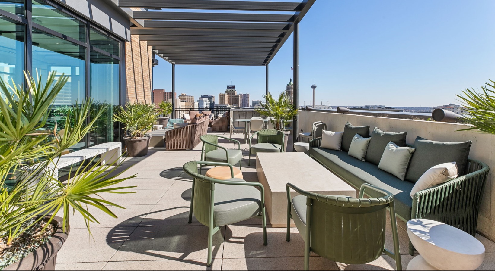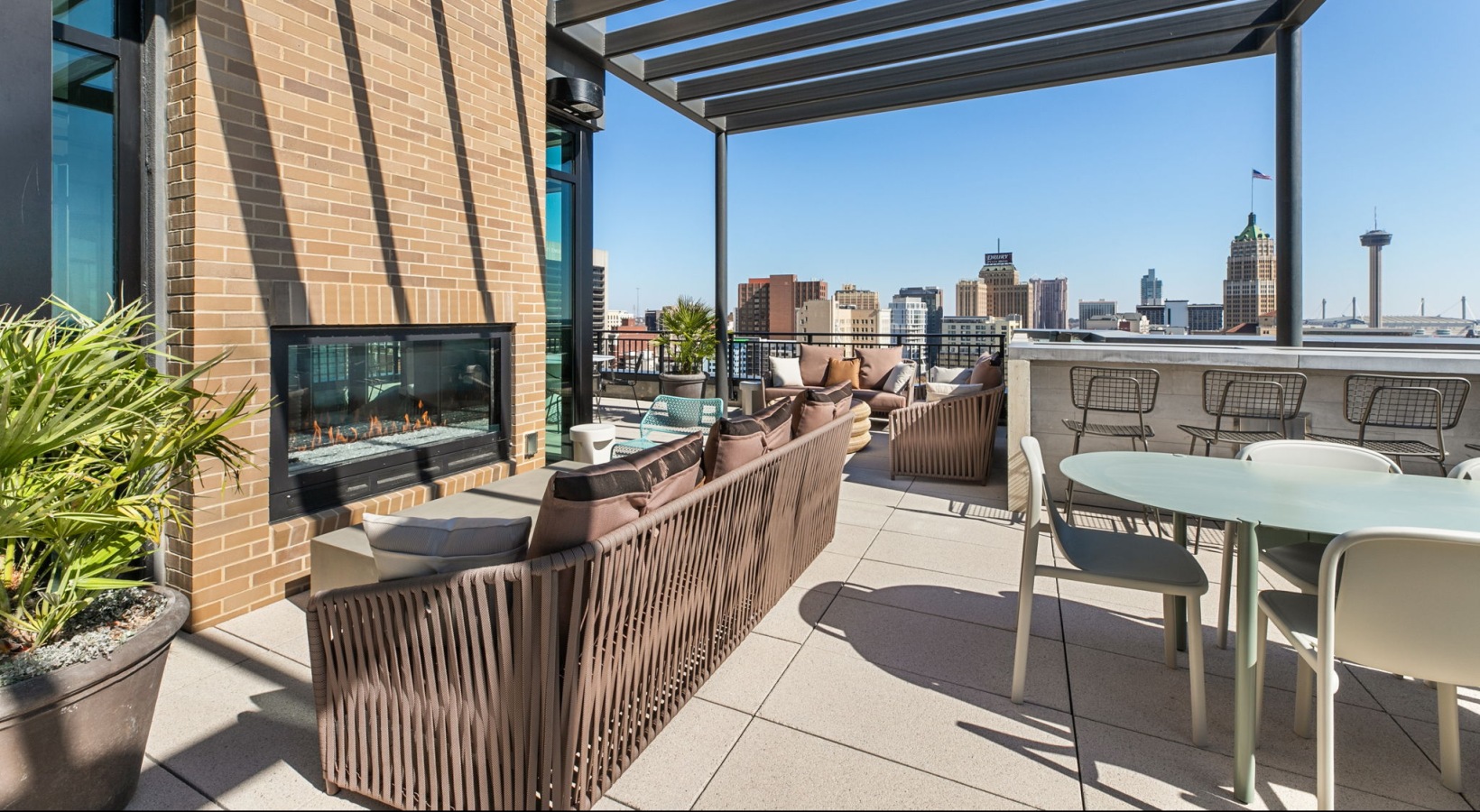 • Elevated urban living near the San Antonio River Walk with a rooftop lounge offering shaded pergolas, comfortable seating, and sweeping downtown views.