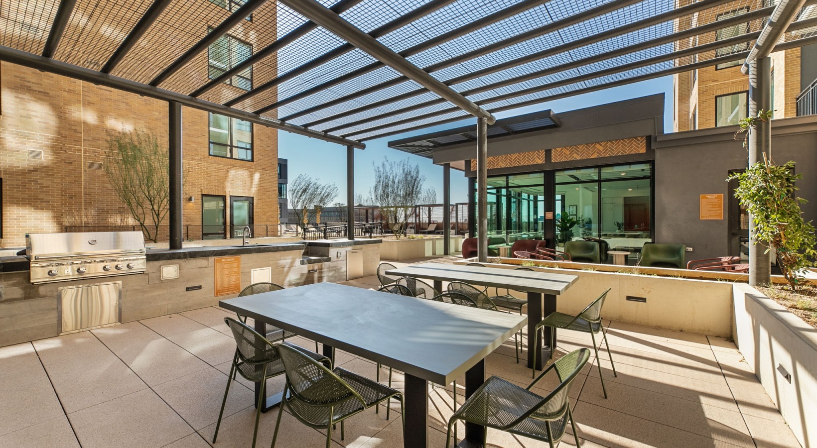 • Rooftop lounge offering shaded pergolas, comfortable seating, and sweeping downtown views.